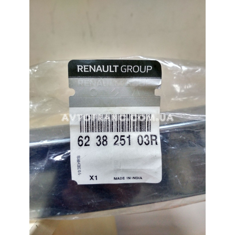 Накладка решітки хром Renault Dokker (2017-...) Оригінал 623825103R від заводу виробника Renault, виготовлена з високоякісного пластику. Підходить на автомобілі: Renault Dokker (2017-...), Renault Lodgy (2017-...) року випуску. Оригінальний номер: 623825103R.