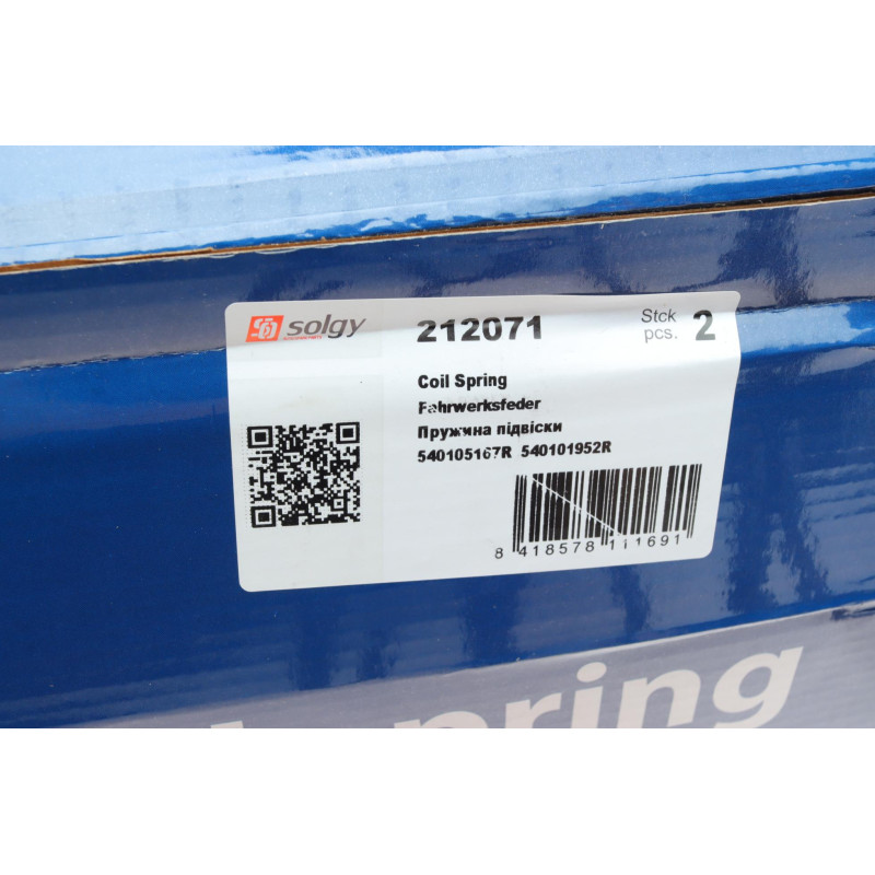 Пружина передня Renault Duster (2010-2017) SOLGY 212071 від іспанського заводу виробника SOLGY. Підходить для автомобілів з дизельним двигуном 1.5 DCI. Застосування: Renault Duster (2010-2017) року випуску. Оригінальний номер: 540105167R.